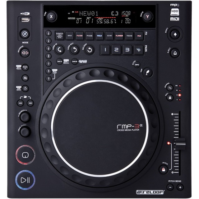 Reloop RMP-3 Alpha - кроссмедиа проигрыватель для управления программным обеспечением типа Traktor. Имеет возможность проигрывать CD, MP3-CD, USB жесткие диски или карты памяти. Благодаря полной совместимости с MIDI, все 48 элементов управления плеера могут использоваться в качестве контроллера. При помощи переключателя на панели управления вы можете управлять двумя виртуальными деками с одной RMP-3 Alpha. Настройки могут быть сохранены в качестве MIDI пресетов для различных приложений.