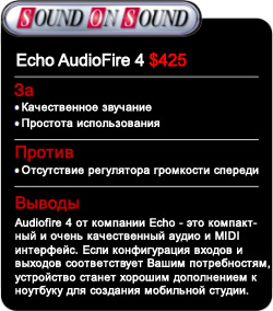 Подытоживая, хотелось бы сказать, потенциальные покупатели навряд ли будут разочарованы этим новым интерфейсом фирмы Echo – прочным, компактным, с хорошим звучанием. Хотя лично для меня количества входов и выходов у Audiofire 4 недостаточно, чтобы я мог использовать его как основной интерфейс на своей собственной project-студии, но я бы с удовольствием положил его в сумку с моим ноутбуком и был бы полностью уверен, что у меня всегда будет возможность сделать высококачественную звукозапись вне студии.