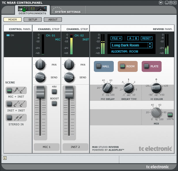 Программа TC Near Control Panel обеспечивает доступ к ревербератору M40 Studio Reverb, который можно использовать при прослушивании во время записи, а на линейках микшера в зависимости от выбранной «сцены» появляются дополнительные элементы управления.