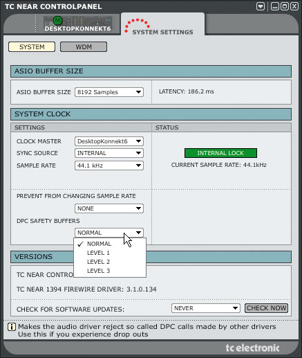 Как известно многим музыкантам, большинство аудио интерфейсов Firewire имеют дополнительную буферную память, которая превосходит обычную и используется совместно с ней, что обеспечивает ровное воспроизведение. ТС же позволяет Вам пошагово изменять размер защитного буфера для работы совместно с РС. Если Вы не испытываете проблем с пропаданием сигнала, лучше по возможности использовать нормальный режим (Normal), так как, согласно моим измерениям с помощью программы Centrance ASIO Latency Test Utility, при постоянной задержке на входе каждый следующий более высокий уровень буфера при частоте дискретизации 44,1 кГц добавляет примерно 6 мс задержки на выходе.