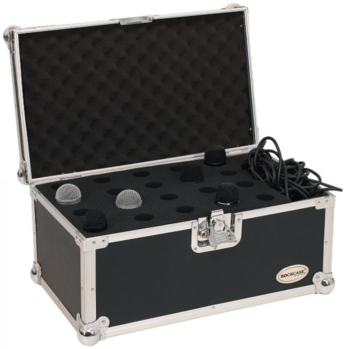Жесткий кейс для 20-микрофонов, материал: фанера с черным ПВХ, алюминиевый каркас, стальные углы, обивка: пенный материал, отсеки для микрофонов и аксессуаров, замок бабочка, вн. размеры: 495х177х248 мм.