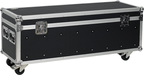Жесткий кейс для шнуров и оборудования, корпус: 10 мм фанера с ПВХ, 2 замка бабочки, 4 ручки, алюминиевый каркас, хром углы, 6 внутренних ячеек, 4 колеса (2 с тормозами), размеры: 120х40х40 см.