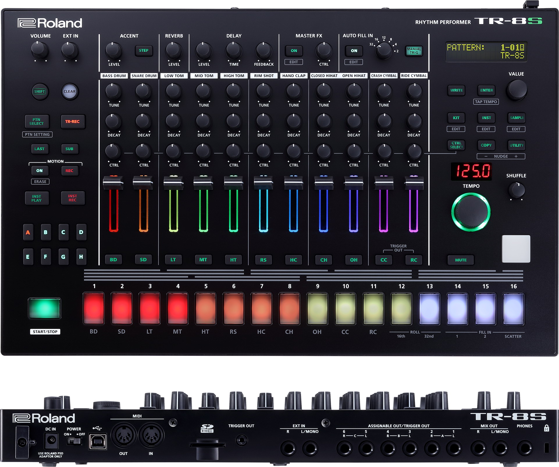 Самая продвинутая ритм-машина, 128 паттернов, 16 шагов, 8 (A-H) вариаций на паттерн с 3-мя сбивками, 16 кнопок TR-REC, Master FX, слот для SD-карт, USB-MIDI порт, ЦАП 24 бит/96 кГц.