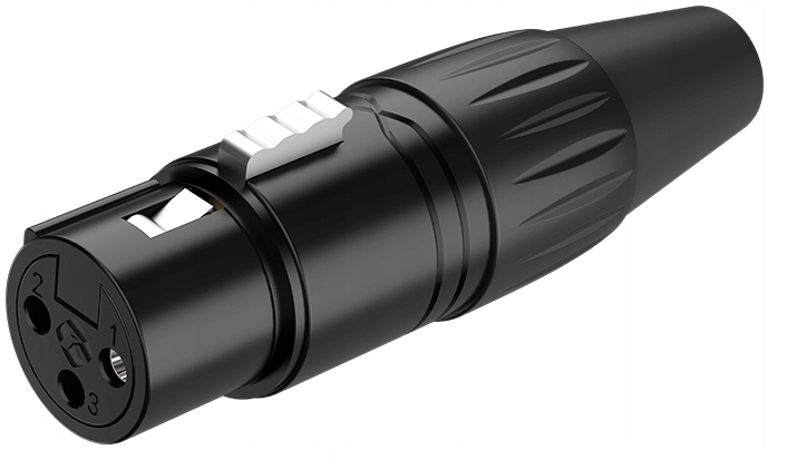 XLR female (мама) 3-полюсный, корпус: литой цинковый сплав, контакты: луженые, Ø кабеля: 3-7 мм., цвет: черный (электрофоретическая краска)