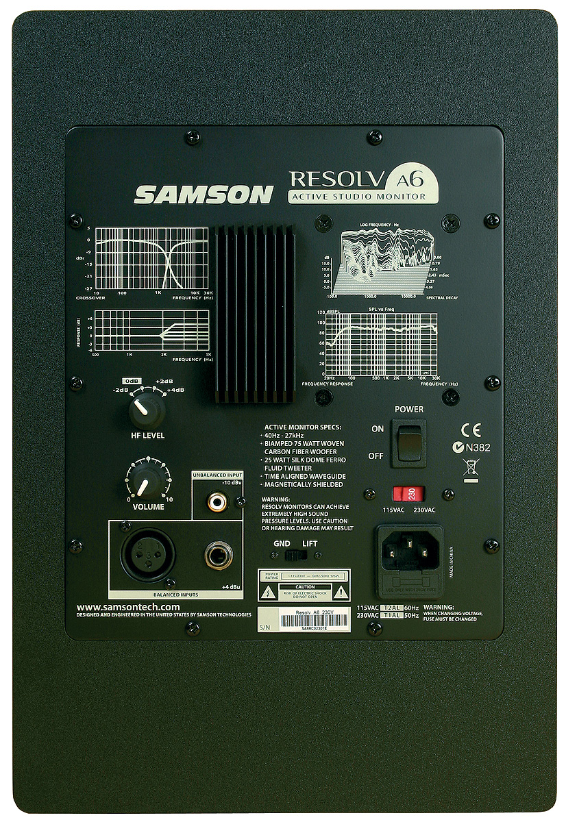 Samson Resolv A6 - активные студийные мониторы ближнего поля с отличной детализацией звука во всем диапазоне частот, возможность коррекции АЧХ, развитая система коммутации входов, а также возможность наращивания системы при помощи специально разработанного сабвуфера.