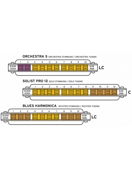 Діатонічна губна гармоніка в строї Solo та стійкими до корозії язичками з нержавіючої сталі, ергономічними кришками і червоним пластиковим корпусом. Зазвичай тоніка розташована в першому отворі (видих). У моделі Orchestra S ми розташували тоніку в отворі №3 (видих), а в перших двох розташована половина нижньої октави. Багато музикантів відчувають брак басових нот при грі на гармоніці в стандартному строї Ріхтера - Orchestra S дає їм можливість брати ці ноти без застосування бендів. Це робить Orchestra S ідеальним сольним інструментом.