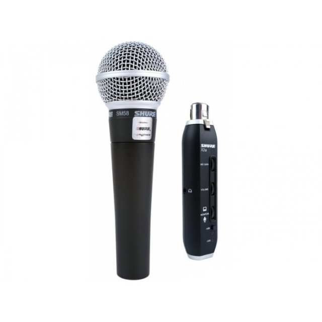 Комплект, состоящий из вокального кардиоидного динамического микрофона SM58 и компактного микрофонного 16bit/48kHz USB-аудиоинтерфейса X2u для записи на базе РС/Мас.