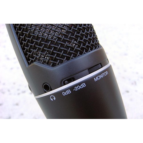 Студийный конденсаторный USB микрофон, НЧ-фильтр/аттенюатор -20dB, 1/8 Mini Jack выход на наушники, направленность кардиоида, АЧХ 20Гц-20кГц, SPL 154дБ, чувствительность −41 dBV/Pa, 438 г.