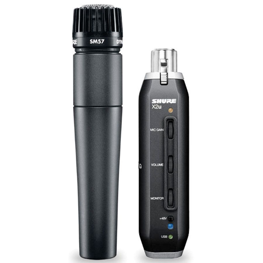 Комплект, состоящий из инструментального кардиоидного динамического микрофона SM57 и компактного микрофонного 16bit/48kHz USB-аудиоинтерфейса X2u для записи на базе РС/Мас.