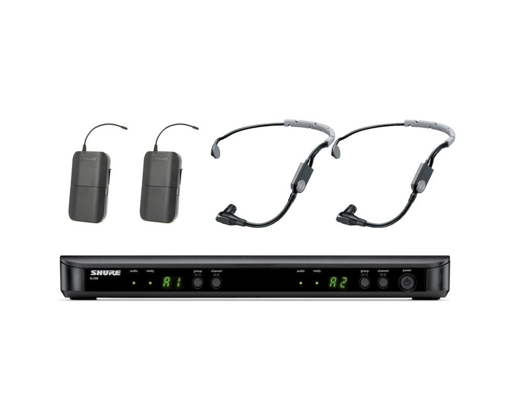 Комплект 2-канальной радиоприемник BLX88 с 2-я поясными передатчиками BLX1 с 2-я гарнитурами SM35, оперируемые частоты: 662-686 МГц, SPL до 120 дБ, радиус действия до 91 м, время работы 14 ч.