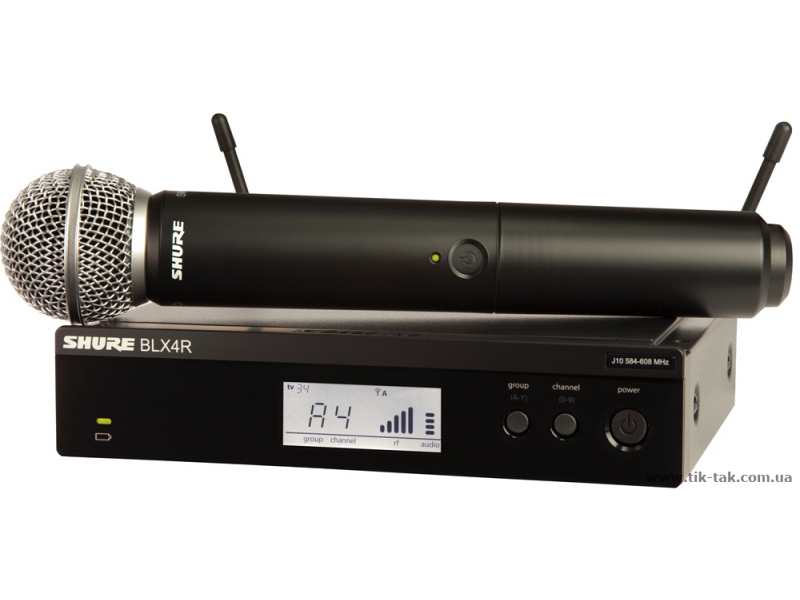 Комплект одноканальной микрофонной радиосистемы BLX4R с ручным динамическим микрофоном BLX2/SM58, держатель, оперируемые частоты: 524-865 МГц, радиус действия до 91 м, время работы до 14 часов.