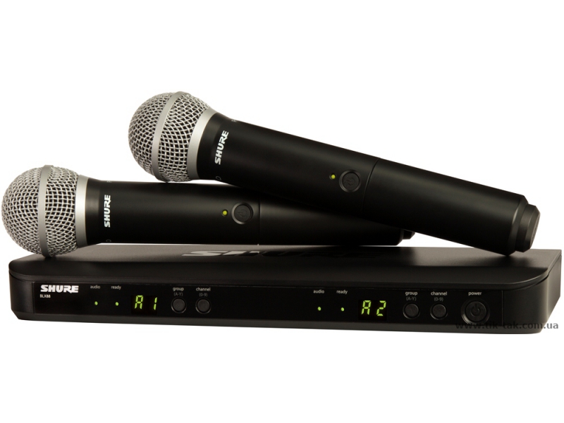 Комплект 2-канальной радиоприемник BLX88, 2 ручных микрофона PG58 с передатчиком BLX2, оперируемые частоты: 524-865 МГц, радиус действия до 91 м, время работы до 14 часов.