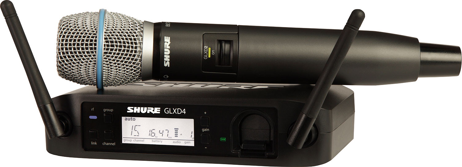 Цифровая радиосистема, диапазон 2.4 ГГц, суперкардиоидный конденсаторный капсюль, ручной передатчик GLXD2, радиус действия 60 м, до 16 часов работы на аккумуляторе.