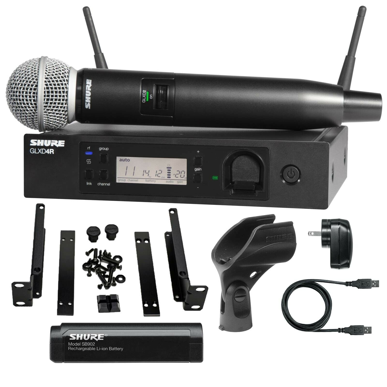 Цифровая радиосистема, диапазон 2.4 ГГц, кардиоидный динамический капсюль SM58, ручной передатчик GLXD2, радиус действия 60 м, до 16 часов работы на аккумуляторе, включает крепление в 19 рэк.