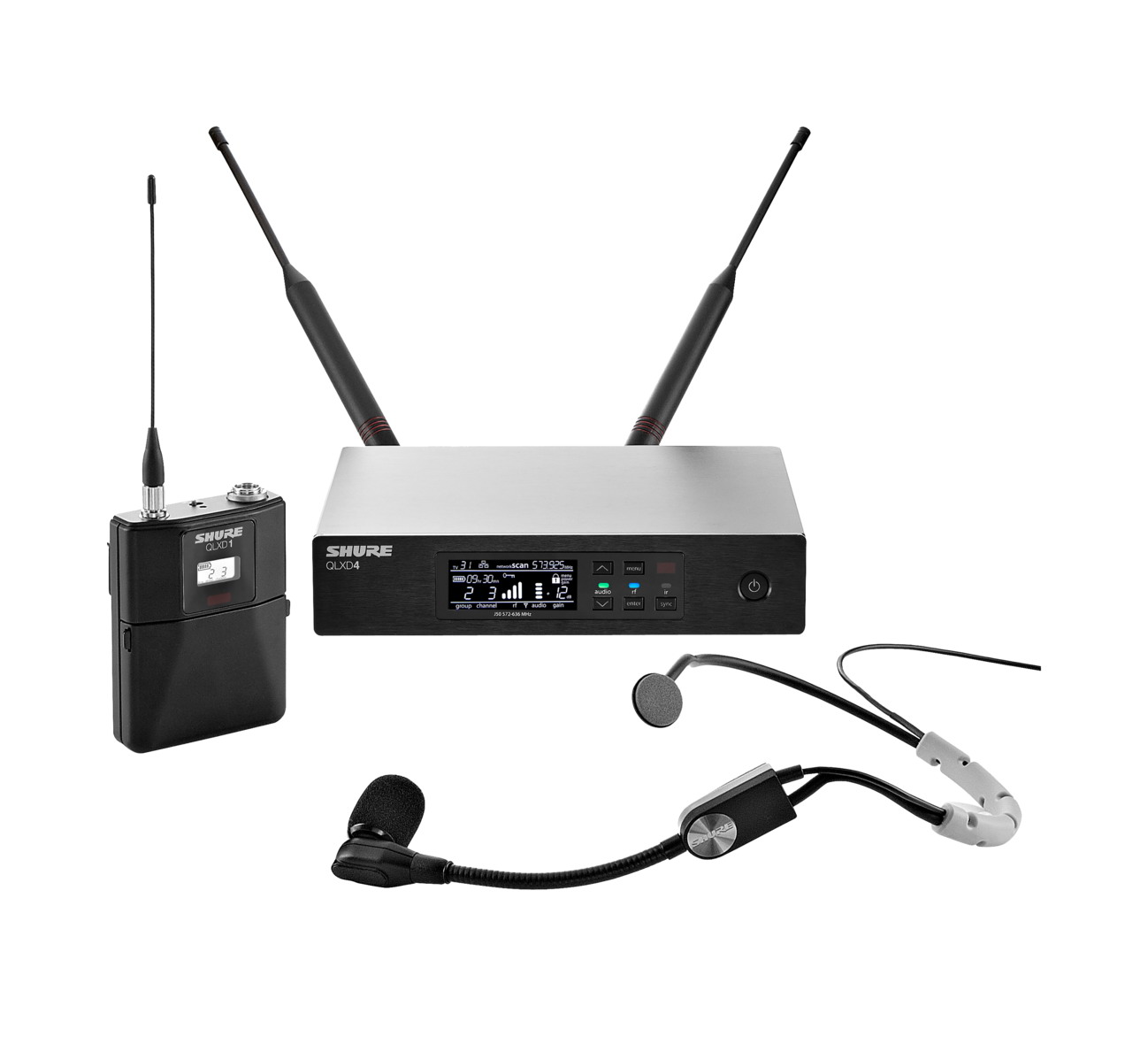 Цифровая радиосистема с поясным передатчиком QLXD1, приемником QLXD4 и кардиоидной конденсаторной гарнитурой SM35, 60 каналов, шаг 64 МГц, разъемы 1/4 Jack/XLR - TA4M, AES 256-битное шифрование, радиус действия 100 м.