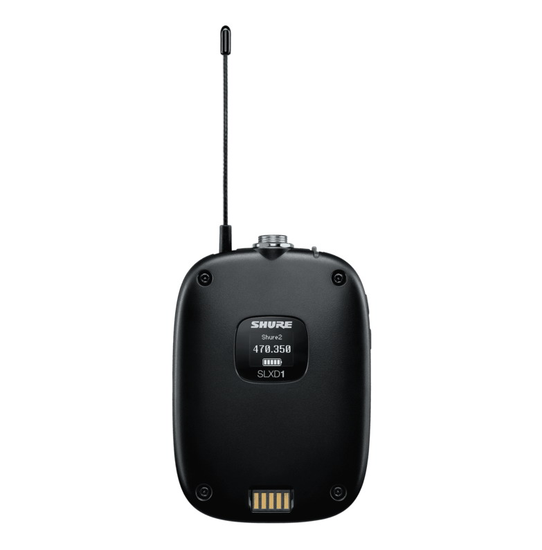 Поясной передатчик для систем SLX-D, диапазон 470–937.5 МГц/24-бита, ИК-синхронизация, гнездо TA4M, 32 канала, до 12 систем на одном канале, радиус действия 100 м, входной сигнал: макс.+8.2 dBV,питание: 2 батареи АА (автономность 8 ч).