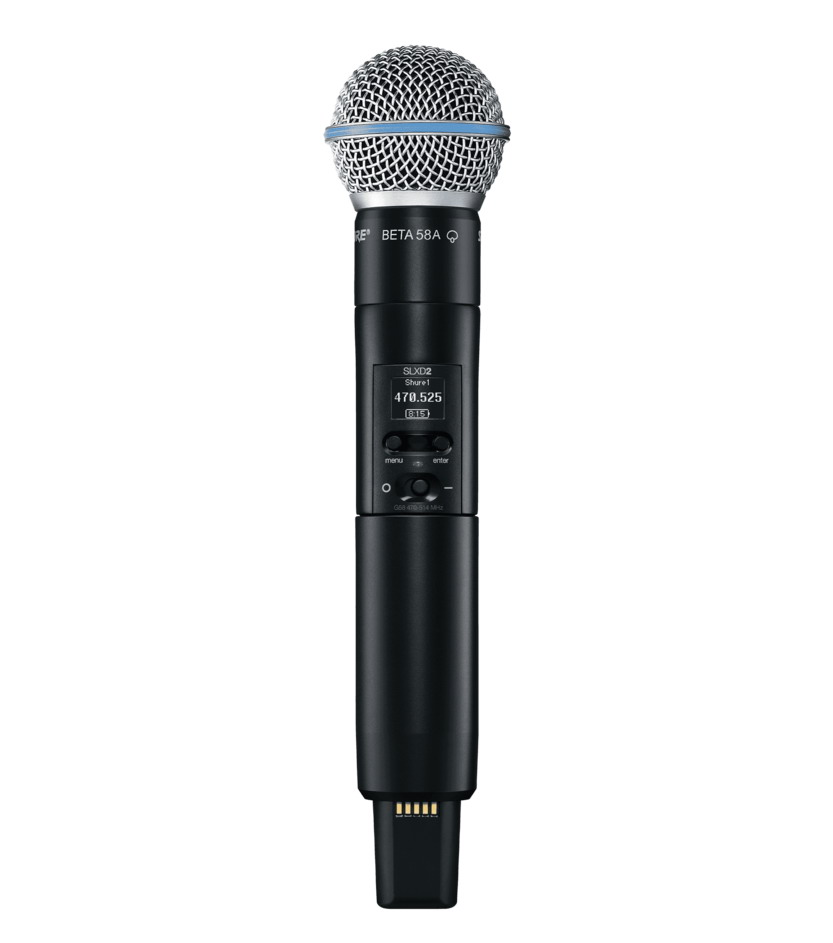 Цифровая радиопередатчик SLXD2, капсюль Beta58a (динамический/суперкардиоида), диапазон 470–937.5 МГц/24-бита, ИК-синхронизация, 32 канала, радиус действия 100 м, питание: 2 АА (автономность 8 ч).