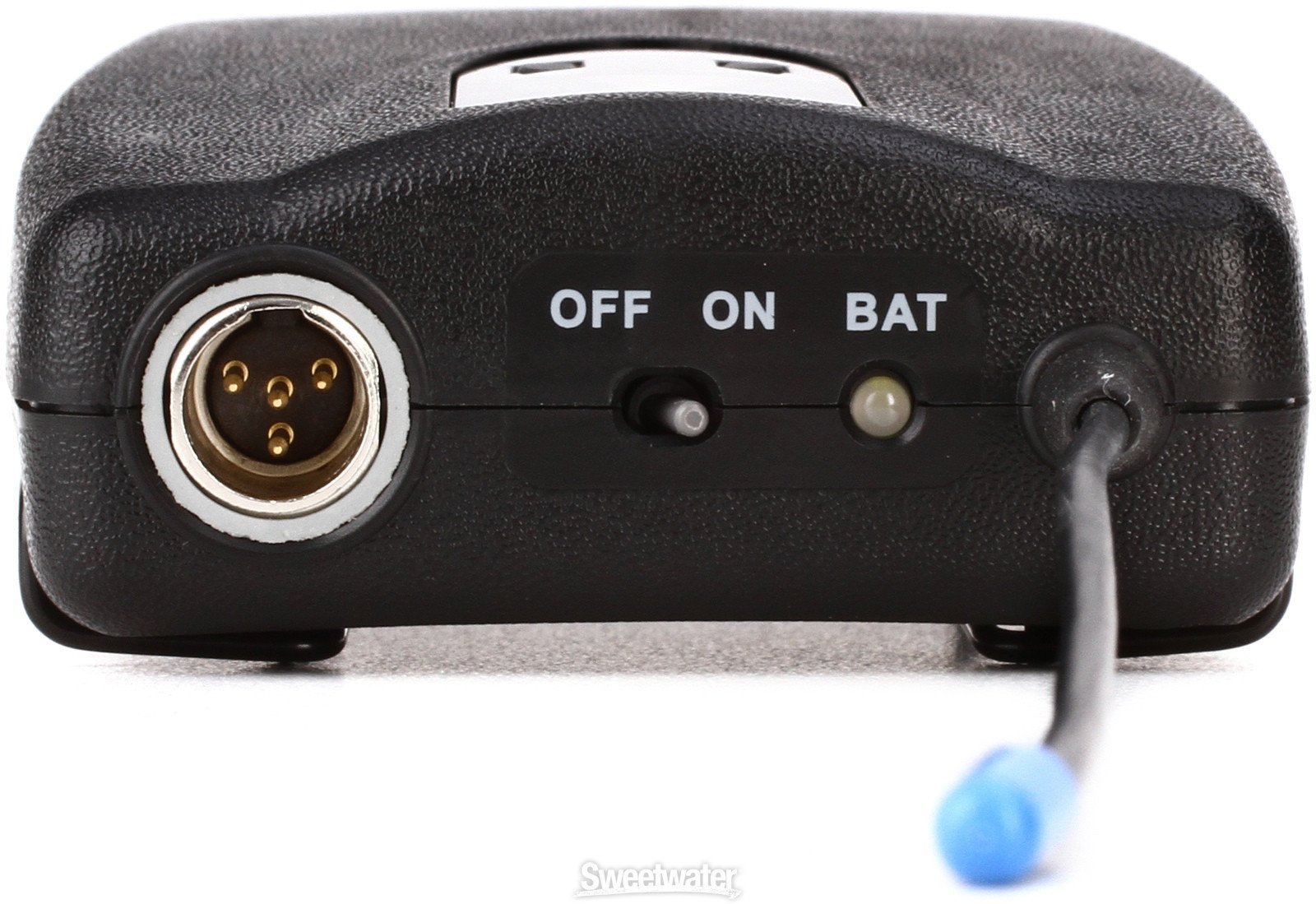 Поясной передатчик UHF диапазона 829–865 МГц, 1/4 волновая антенна, мощность 30 мВт, гнездо TA4F под фиксацию, радиус действия 100 м, аттенюатор: 0/-20 дБ, питание: крона 9В (автономность 8 ч).