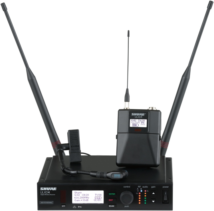 Цифровая UHF-радиосистема, диапазон 6 ГГц, 60 каналов, поясной передатчик ULXD1 с инструментальным микрофоном на прищепке 98H/C, 256-битное кодирование AES, радиус действия 100 м, АКБ Li-ion до 12 часов непрерывной работы.