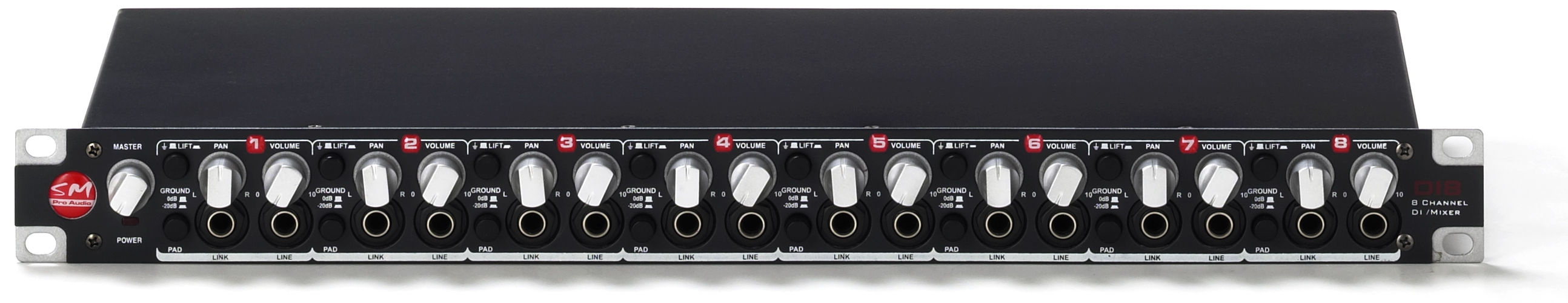 DI8 - 8ми канальный линейный микшер. 8-ми канальный DI Box/микшер, каждый вход имеет связь и сбалансированный выход, клавиша -10 дБ на канал, регулировка громкости и панорамы на каждом канале, линейный стерео выход, входной стерео вход, регулятор уровня мастер-выхода.