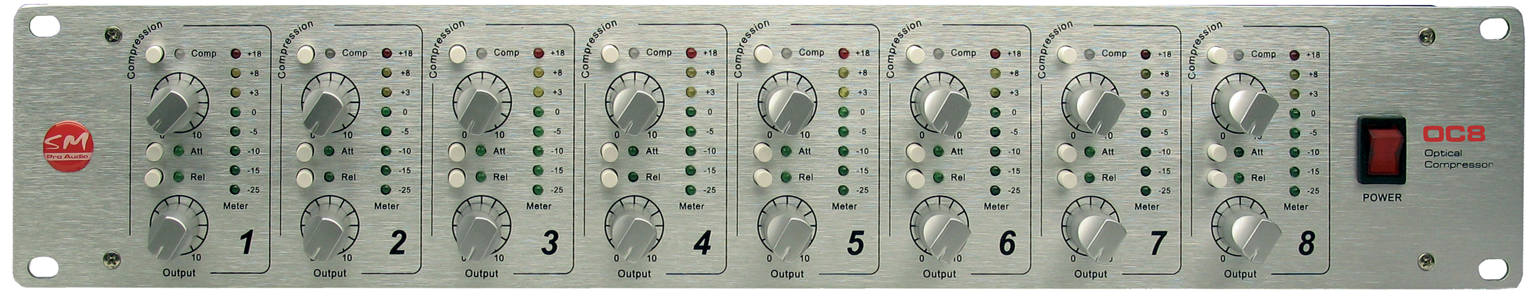 8-канальный оптический компрессор. Мягкая компрессия с регулируемым коэффициентом сжатия, безтрансформаторный звуковой тракт класса А, светодиодный индикатор, низкий уровень шумов, широкий частотный и динамический диапазон, 1/4'' линейные вх/вых, размер 2U.