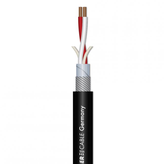 Симметричный аналоговый кабель, сечение 0.50 мм²(20AWG),жила 28х0.15 мм OFC чистая медь, 100% витой экран из луженной меди+металлизированный флис, Ø-6.5 мм, изоляция ПЕ, оболочка ПВХ, цвет черный.