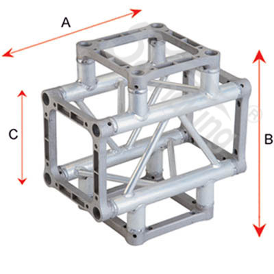 Прямоугольный алюминиевый уголок переходник, 4 направления под углом 90º, прочный высококачественный сплав ALSi, размеры 50 х 50 х 50 см, прямоугольная крепежная секция со стороной 290 мм, несущая труба Ø-50 мм, толщина стенки 2.0 мм, соединительные распорки Ø-20 мм, толщина стенки 2.0 мм, порошковая защитная покраска.