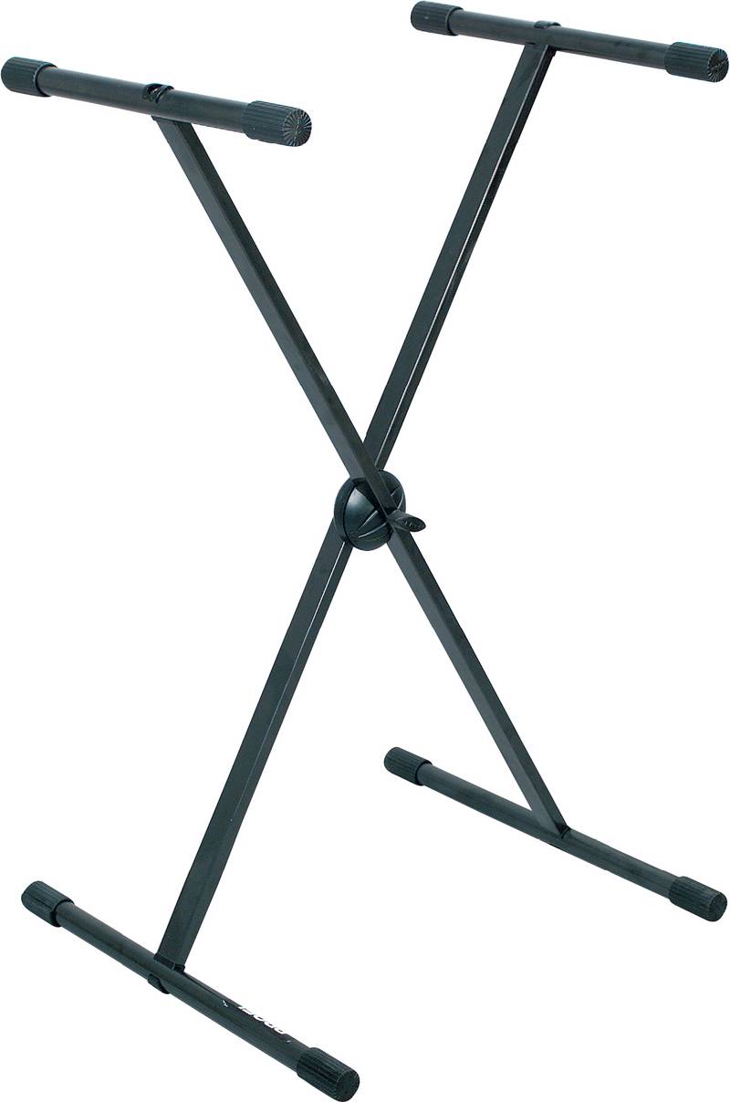 Стойка для клавишных инструментов, Х-образная одинарная, множество фиксированных положений высоты, фиксатор: резьбовой зажим, толщина металлического профиля: 28 мм, регулированная высота: 17-97 см, ширина основания под инструмент: 40 см, резиновые подушки, разборная конструкция, вес 4.3 кг, материал сталь/цинк, цвет: черный.