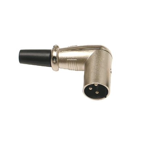 Стандартный 3-х контактный угловой коннектор XLR «папа», никелированные контакты, цинковый корпус покрытый никелем, металлическая втулка фиксатор с резиновой манжетой и двумя болтами.