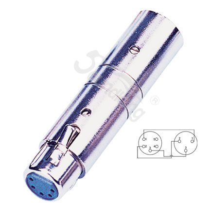 Переходник 3-х контактный XLR «папа» - 5-контактный XLR «мама», никелированные контакты, цинковый корпус покрытый никелем.