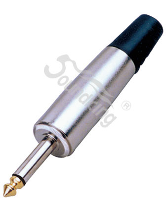 Стандартный небалансный 2-х контактный 6.35 мм TRS Jack повышенной мощности для АС, сечение кабеля до 2 мм², Входной Ø-19 мм, позолоченный центральный контакт, цинковый корпус увеличенного размера покрытый никелем, втулка фиксатор с резиновой манжетой.