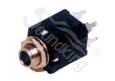 Стандартный закрытый панельный стерео 1/4 (6.35 мм) Jack разъем типа «мама» с позолоченными контактами, горизонтально/вертикально монтируемый, черный пластиковый корпус с гайкой для фиксации.