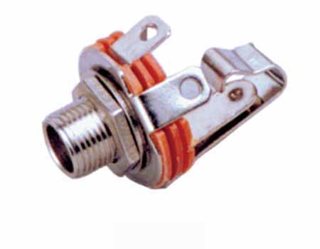 Стандартный панельный моно 1/4 (6.35 мм) Jack разъем типа «мама» с никелированными контактами, красным изолятором в металлическом корпусе с гайкой для фиксации.