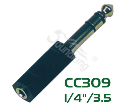 Переходник стерео 6.35 мм (1/4) TRS Jack «папа» - 3.5 мм (1/8) miniJack «мама», никелированные контакты, пластиковый корпус.