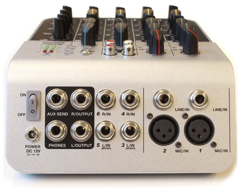Микшерный пульт, 2 микрофонных (XLR), 2 стерео линейных входа (1/4), +48 В, CD, MP3 вход 1/8 TRS, 2-полосный эквалайзер, регулировка выхода на наушники, Aux выход, 4 уровневые индикаторы уровня.