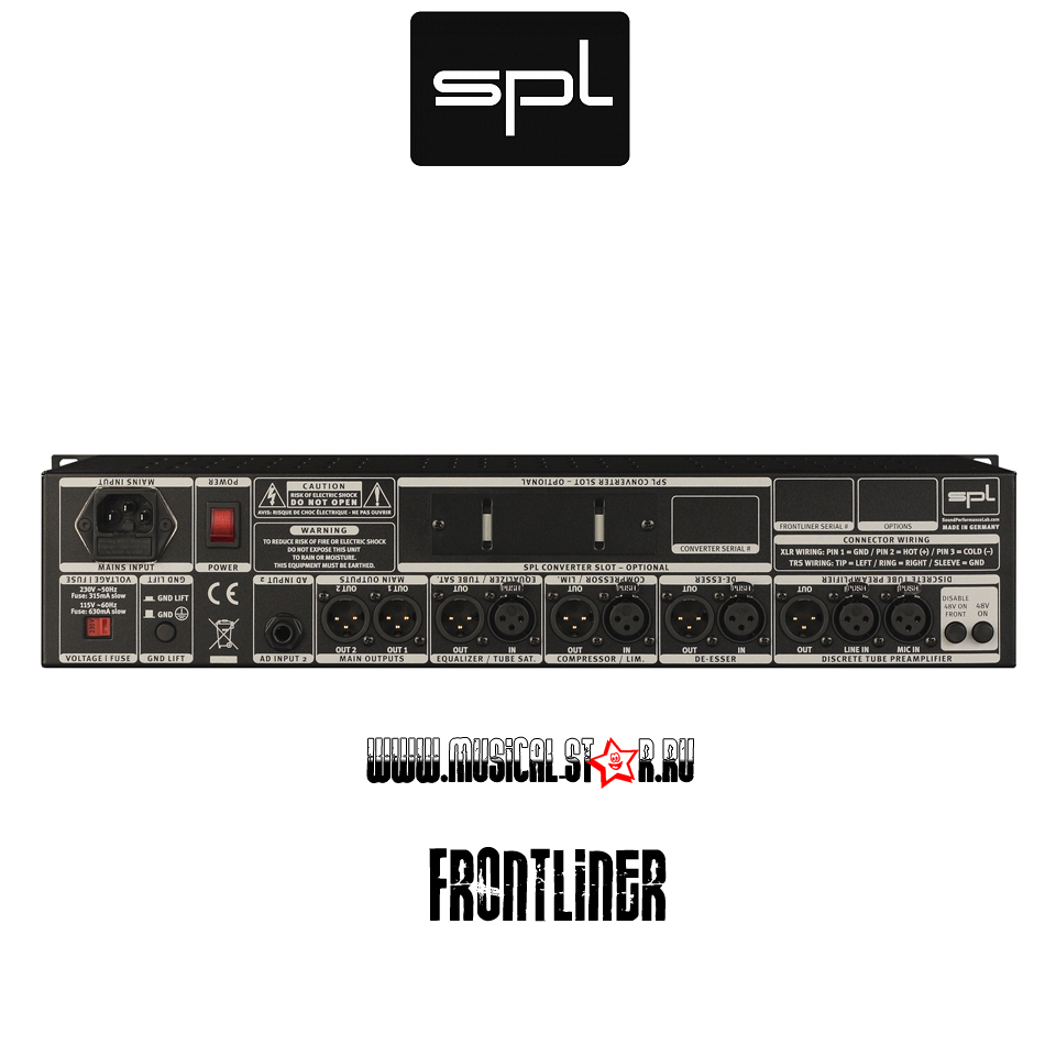 С лучших ингредиентов от SPL, новый флагман канальных линеек SPL Frontliner устанавливает новые стандарты для класса записи. Совершенно новый Frontliner имеет все обработки для записи вокала и инструментов в отличном качестве. Благодаря индивидуальному аналоговому вводу/выходу Frontliner, любые аналоговые процессоры могут быть сконфигурированы в любой студии во время сведения и мастеринга. Таким образом Frontliner не является целенаправленным устройством, а является универсальным - особенно в студиях для полноценной аналоговой обработки на любом этапе аудио-производственного процесса.