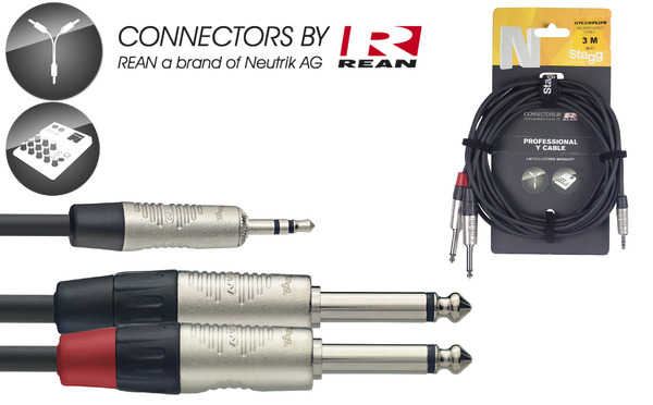 Коммутационный кабель с Y-разветвлением, коннекторы 2х6.35 мм TS Jack - 3.5 мм TRS Mini Jack, металлические коннекторы Rean, диаметр кабеля: 5 мм, длина: 3 метра, цвет: черный.