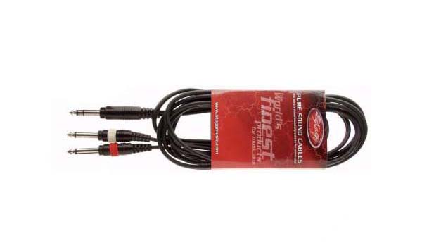 Коммутационный межблочный кабель с Y-разветвлением, коннекторы 2 х 6.35 мм TS Jack - 6.35 мм TRS Jack «папа», пластиковые коннекторы Stagg, диаметр кабеля: 4 мм, длина: 3 метра, цвет: черный.