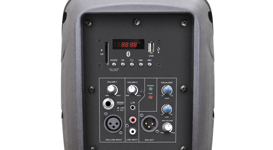Активная АС, 12" НЧ динамик, 1" компрессионный ВЧ драйвер, мощность 150 Вт, АЧХ 60 Гц - 20 кГц, 2 микроф./линейный XLR/RCA/MiniJack, выход XLR/Jack, модуль Bluetooth, SD слот, USB порт, стакан.