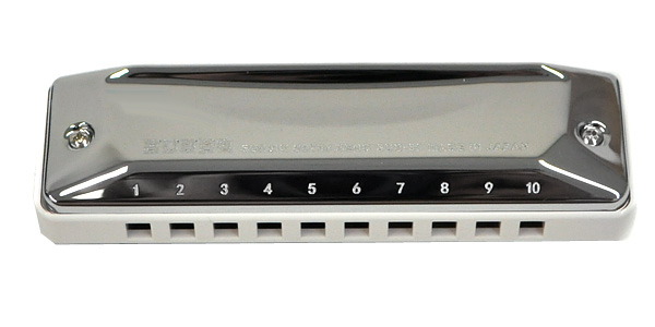 Диатоническая губная гармошка, 10 отверстий, 20 нот, 3 ключа (A, C, D), корпус: хромированная латунь, 30 язычков, размеры: 104х30х22 мм, вес: 70 г. с футляром.