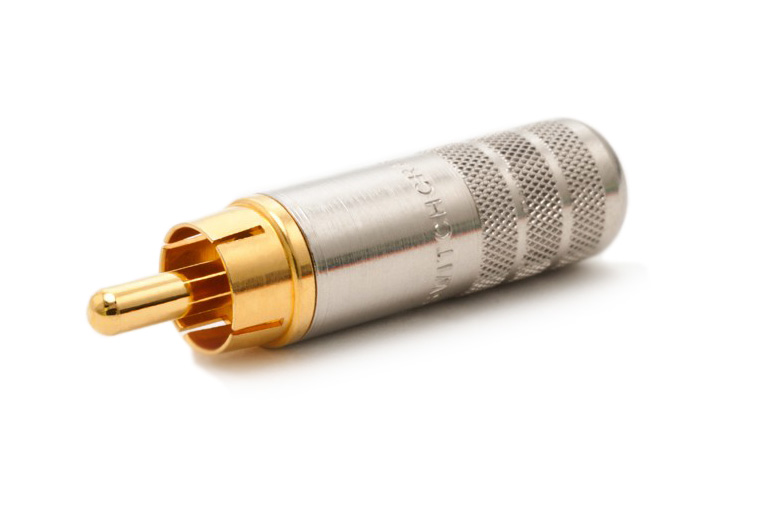 Профессиональный RCA коннектор «папа», позолоченные контакты, бронзовый корпус покрытый никелем, длина 40.2 мм, кабель Ø-7.366 мм.