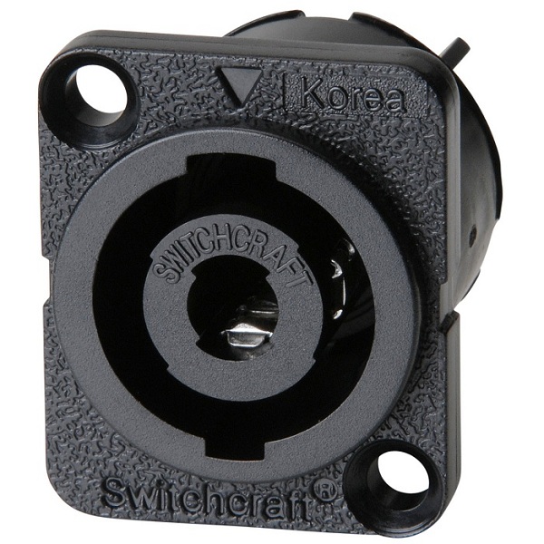 4-х контактное панельное гнездо SpeakON «папа» для АС, специальный сплав меди с посеребренными контактами, пластиковый корпус черного цвета, подключение клеммы Facton 0.250".