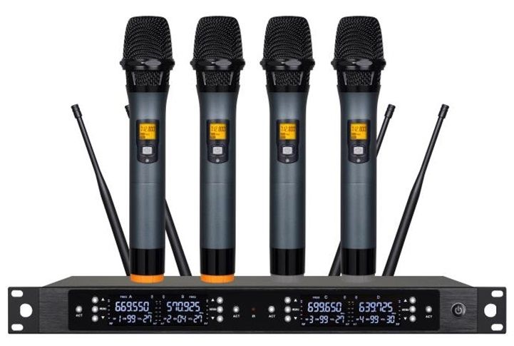 Беспроводная 4-х канальная радиосистема, 4 ручных микрофона, UHF диапазон 570 МГц - 699МГц, капсюль: динамический (кардиоида), АЧХ 40 Гц - 15 кГц, технология PLL (ФАПЧ), 4 балансных XLR/Jack выхода, радиус действия: 40 м., система шумоподавления, габарит: 19" рэк 1 U.
