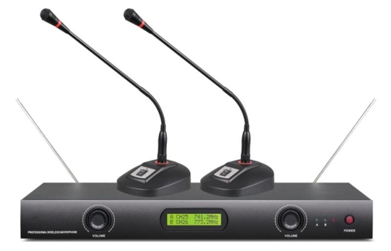 Беспроводная конференц система, 2 радио микрофона на гусиной шее, UHF диапазон 640 МГц - 690МГц, капсюль: динамический (кардиоида), АЧХ 40 Гц - 15 кГц, 2 балансных XLR/Jack выхода, радиус действия: 40 м., система шумоподавления, питание: 2х2 АА (до 8 часов).