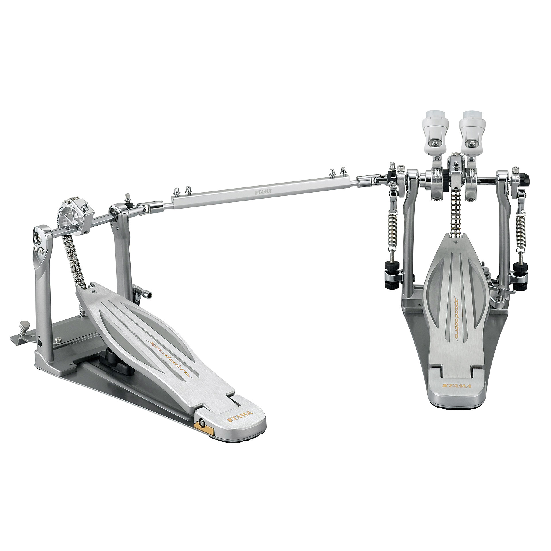 TAMA HP910LWN - двойная педаль для бас-бочки серии Speed Cobra, имеет простой и удобный механизм настройки угла наклона колотушки, стальной зажим обруча с барашковым винтовым зажимом, механизмом натяжения цепи с прочным фиксатором положения, стальные тяги опорной рамы педали и двойной цепной привод.