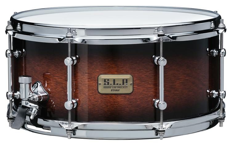 Малый барабан 14х6.5 серии SLP, 6 слойный капур (5 мм корпус), хромированная фурнитура, обруч 8 на отверстий, замок MLS50A/MLS50B, подструнник MS20SN14S, лаги MTL60 Brass, цвет Black Kapur Burst.