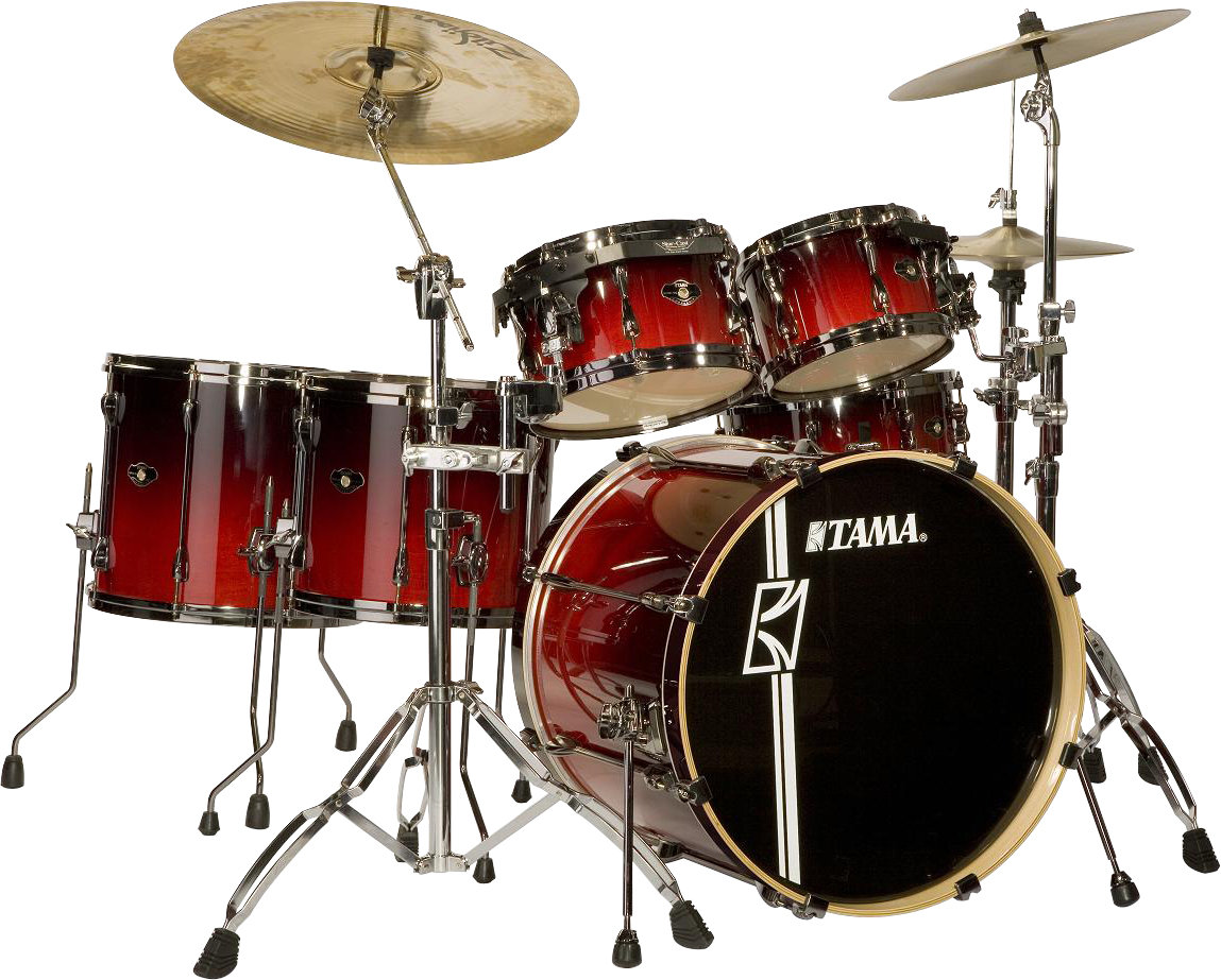 Ударная установка из 6-барабанов, бочка 20x22, флор томы 14x16 и 12x14, томы 6,5x10 и 7x12, малый 5,5х14, материал береза, цвет фурнитуры черный никель, крепление томов на стойку МС69, цвет красный.