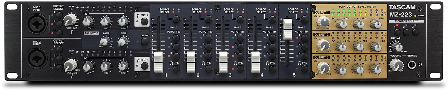 TASCAM MZ-223 предлагает универсальную многозонную маршрутизацию сигнала, микширование и разделение нескольких аудиоисточников одновременно. Исходный сигнал может включать музыку, обьявление (микрофон) и многое другое. MZ-223 просто управляется с помощью фейдеров и элементов управления на передней панели.