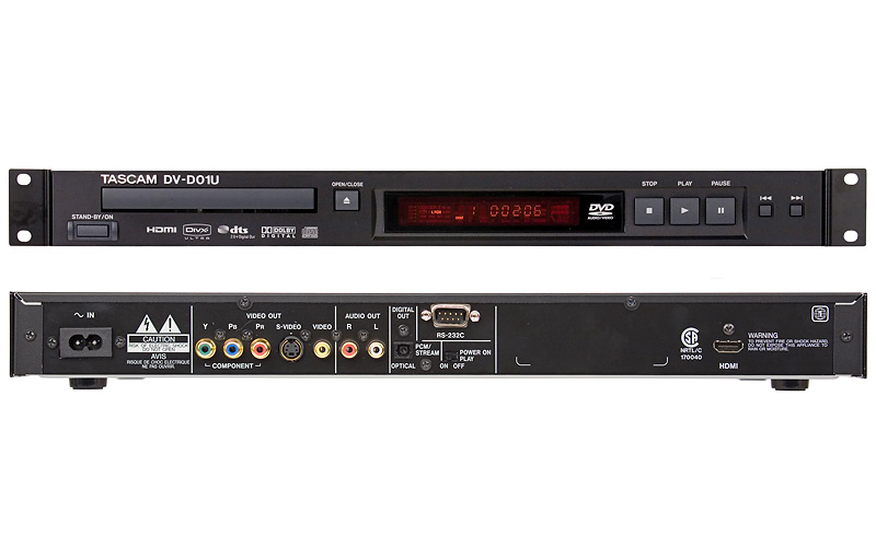 Tascam DV-D01U – HDCP совместимый проигрыватель высотой 1U, с выдвижным лотком для загрузки диска. Данный проигрыватель предназначен для чтения DVD Video, DVD Audio (только 2-канала), Video CD, CD-DA, MP3, WMA, WAV, JPEG, ASF, MPEG-2/MPEG-1 и DivX. Также доступно воспроизведение дисков DVD+R/+RW (только видео форматы). Среди видео выходов DV-D01U для подключения доступны HDMI аудио/видео, композитный выход, S-Video и компонентный разъемы. Аудио – небалансный стерео выход (RCA).