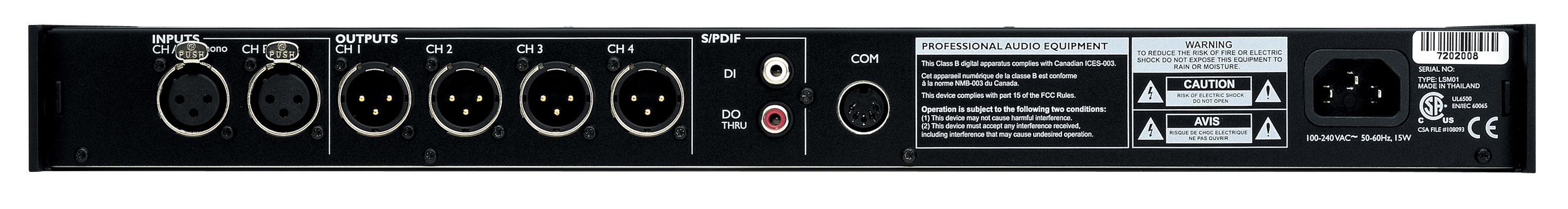 На задней панели расположены два симметричных линейных входа (XLR, аналоговая регулировка чувствительности), четыре симметричных линейных выхода (XLR), электрический цифровой интерфейс формата SPDIF (RCA), служебный COM-порт (DIN-5)